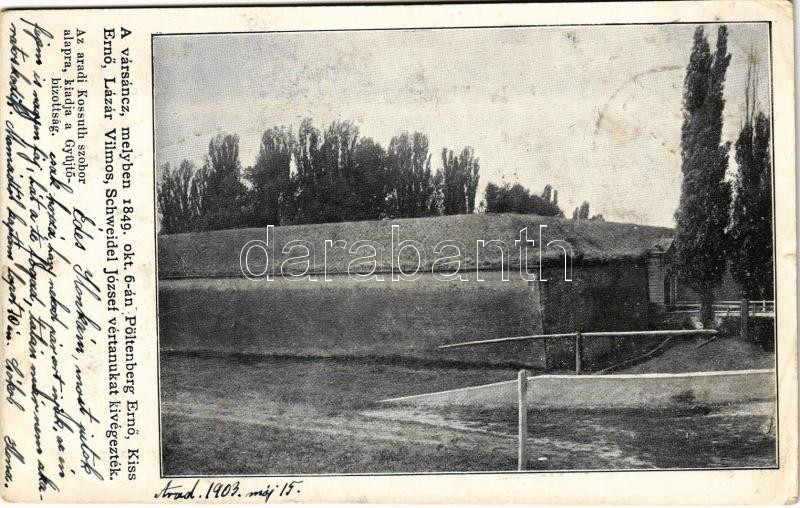 1903 Arad, Vársánc melyben 1849. október 6-án Pöltenberg Ernő, Kiss Ernő, Lázár Vilmos és Schweidel József vértanúkat kivégezték. Az aradi Kossuth szoboralapra, kiadja a Gyűjtőbizottság / castle rampart where the martyrs were killed, Hungarian Revolution of 1848-1849 (EK)
