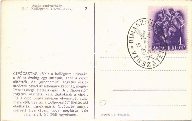 Leírás: Székelyudvarhely, Odorheiu Secuiesc; Református kollégium, cipóosztás, studentika / Calvinist boarding school, Studentica, loaf distribution + "1938 Rimaszombat visszatért" So. Stpl.