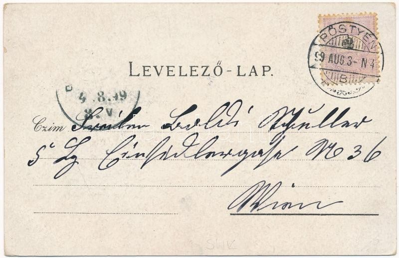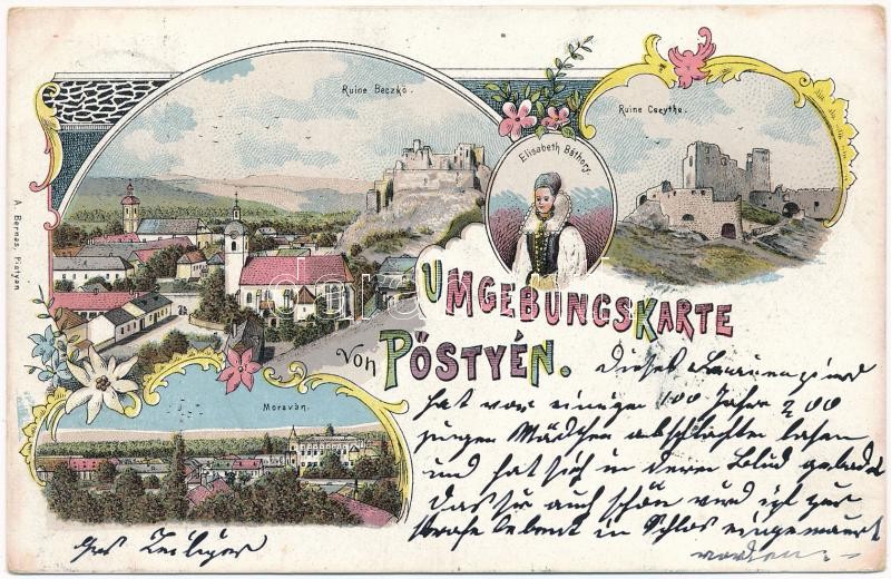 1899 (Vorläufer) Pöstyén, Piestany; Beckó és Csejte várrom, Moraván. A. Bernas / castle ruins of Beckov and Cachtice, Moravany. Art Nouveau, floral, litho