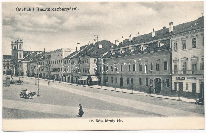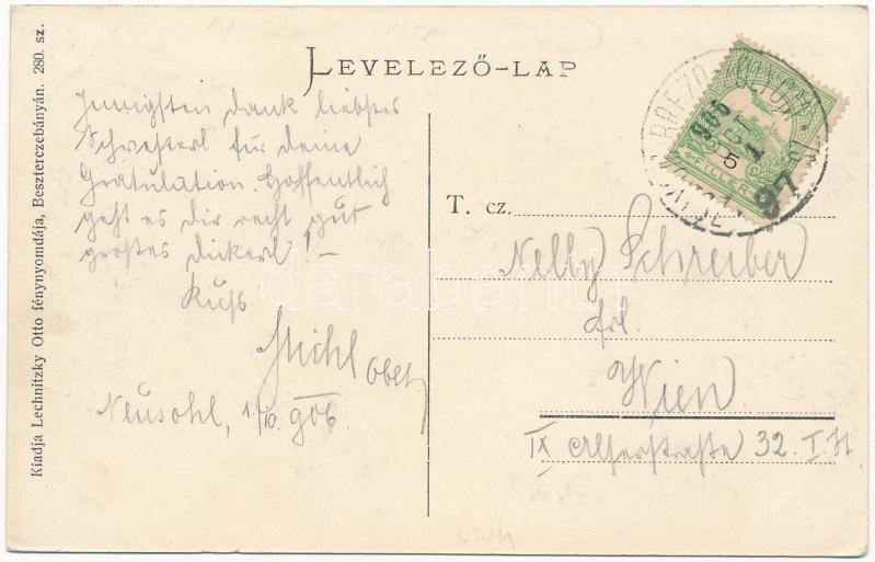 1906 Besztercebánya, Banská Bystrica; Béla király tér, Móry János, Czemann A., Engel Samu üzlete. Lechnitzky Otto fénynyomdája kiadása / square, shops + "ZÓLYOM-BREZÓ - ZÓLYOM 97. SZ." vasúti mozgóposta bélyegző (EK)
