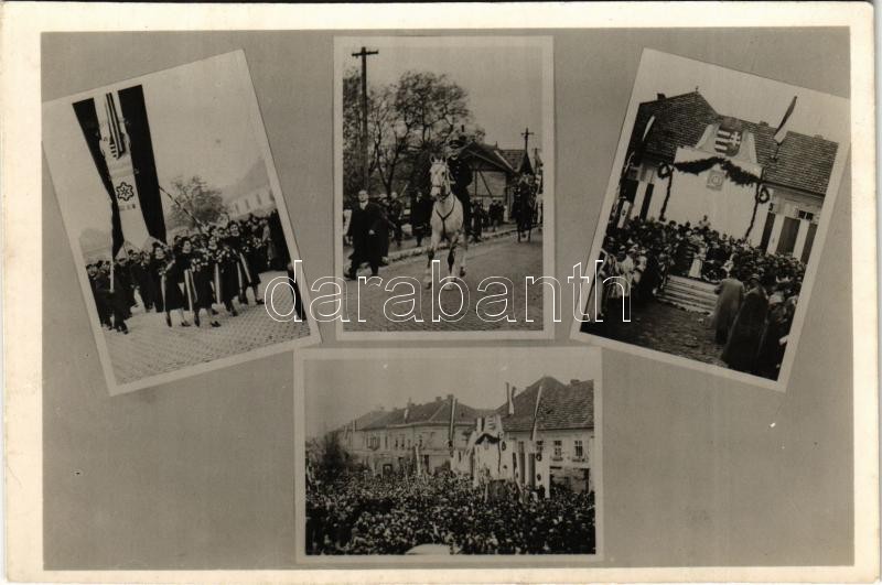 Leírás: 1938 Érsekújvár, Nové Zámky; bevonulás, Horthy Miklós, Mindent Vissza Érsekújvári Frontharcosok zászlóval / entry of the Hungarian troops, flag