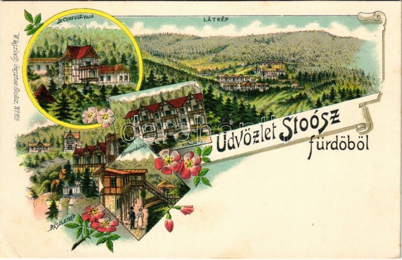 Leírás: Stószfürdő, Stoósz-fürdő, Kúpele Stós; Dr. Czirfusz villa, látkép, Hungária, Kompordai ház. Wlaszlovitsz Gusztáv No. 103. / villas, spa. Art Nouveau, floral, litho (EK)