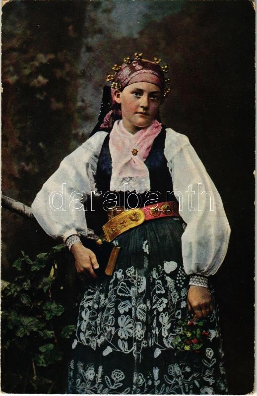 Sächsische Frau / Femeie tinara saseasca / Ifjú szász asszony. H. Zeidner kiadása. Erdélyi népviseletek 4. sz. / Transylvanian folklore, young Saxon lady in folk costumes