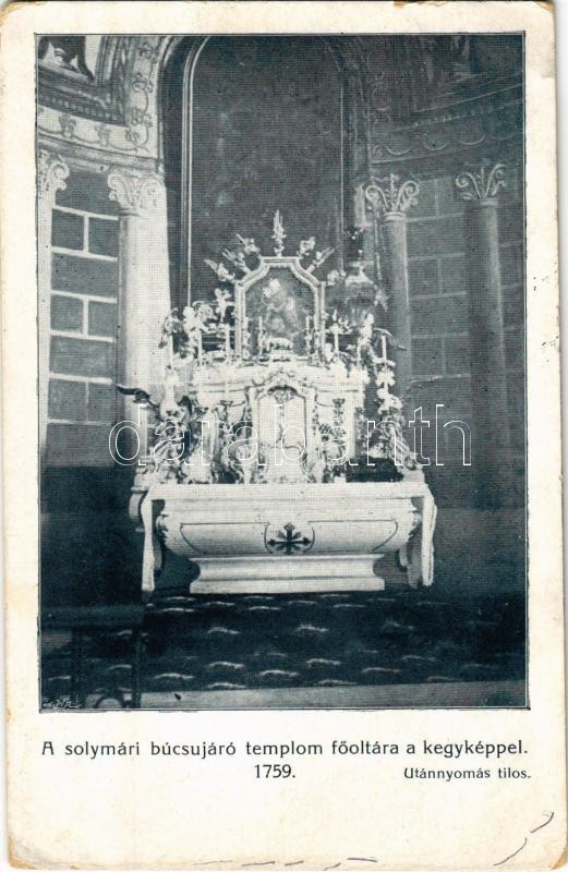 Leírás: 1910 Solymár, búcsújáró templom főoltára a kegyképpel (1759) (kopott sarkak / worn corners)