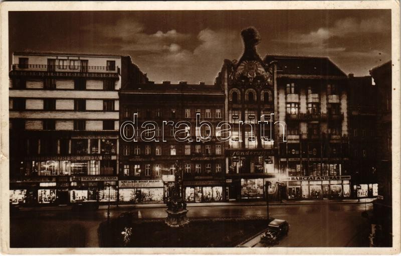 1931 Budapest V. Szervita tér este, Lettersdorfer D. és Fia, Singer Pál, Stern József, Rózsavölgyi és Társa, Bárczai András üzlete, Tündérujjak, automobil