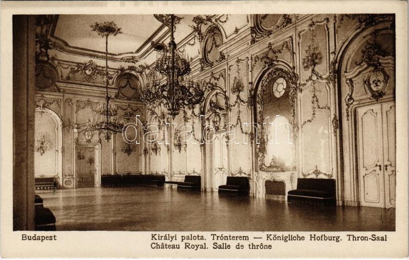 Budapest I. Királyi palota, trónterem, belső. Rigler rt. 81. sz. https://www.darabanth.com/hu/407-Gyorsarveres/407.0/Kepeslapok/Magyarorszag~1000004/Budapest-I-Kiralyi-palota-tronterem-belso-Rigler-rt-81-sz~II2515833