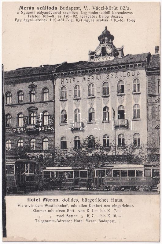 Budapest V. Merán szálloda, Rudas M. fogorvos, villamosok. Váczi körút... https://www.darabanth.com/hu/407-Gyorsarveres/407.0/Kepeslapok/Magyarorszag~1000004/Budapest-V-Meran-szalloda-Rudas-M-fogorvos-villamosok-Vaczi-korut-82a-ma-Nyugati-ter-8~II2516281