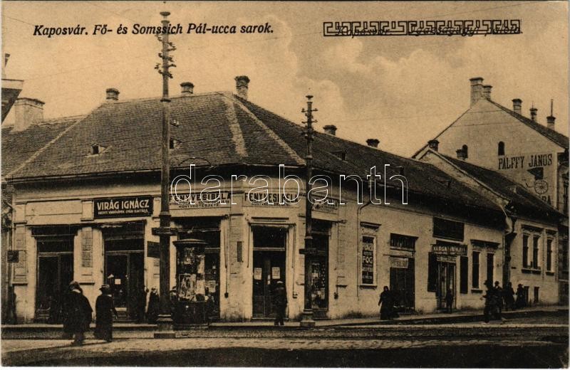 Kaposvár, Fő és Somssich Pál utca sarok, Virág Ignác varrógép raktára, Pálffy János, Práger Andor, Varga üzlete, Fenyvesi Béla könyvkereskedése, könyvnyomdája és könyvkötészete
