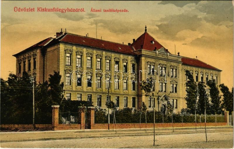 Kiskunfélegyháza, Állami tanítóképezde. Royko B. kiadása https://www.darabanth.com/hu/407-Gyorsarveres/407.0/Kepeslapok/Magyarorszag~1000004/Kiskunfelegyhaza-Allami-tanitokepezde-Royko-B-kiadasa~II2516240
