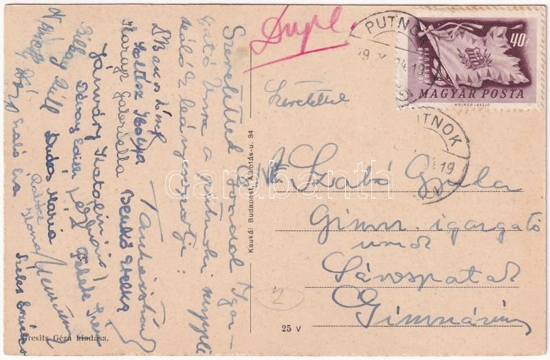 Leírás: Putnok, M. k. Gazdasági felső leánynevelő intézet, M. kir. Háztartási iskola, Tanépület, Internátus. Kiadja Gresits Géza