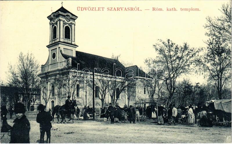 Szarvas, Római katolikus templom, piac. W.L. Bp. 1400. 8083. https://www.darabanth.com/hu/407-Gyorsarveres/407.0/Kepeslapok/Magyarorszag~1000004/Szarvas-Romai-katolikus-templom-piac-WL-Bp-1400-8083~II2514804
