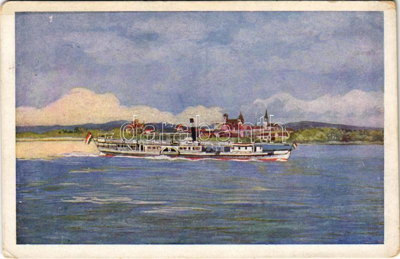 Leírás: Visegrád, "Szentendre" személyszállító gőzös útban Visegrád felé. Művészlevelezőlap M.F.T.R. 6314-18. (EM)