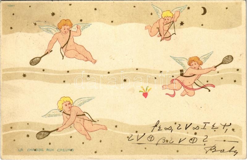1900 La chasse aux Coeurs / angels play tennis with hearts. litho https://www.darabanth.com/hu/407-Gyorsarveres/407.0/Kepeslapok/Muveszlapok~1000069/1900-La-chasse-aux-Coeurs-angels-play-tennis-with-hearts-litho~II2519843