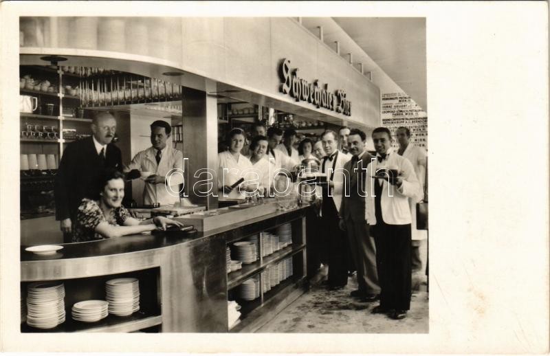 1937 Paris, L'Exposition Internationale de Paris 1937. Café Viennois du Grand Hotel / International Exposition, "Schwechater Bier" Viennese café and beer bar with waiters and waitresses