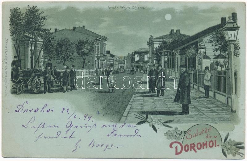 Leírás: 1899 Dorohoi, Dorohoj; Salutari din Dorohoi. Strada Grigore Ghica / street view. Editura Librariei J. L. Bercoviici. Art Nouveau, floral, litho (fa)