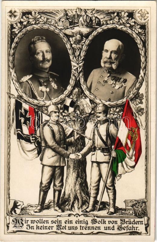 Wir wollen sein ein einig Volk von Brüdern, in keiner Not uns trennen und Gefahr / Franz Joseph I of Austria, Wilhelm II. WWI German and Austro-Hungarian K.u.K. military, Viribus Unitis propaganda with flags and coats of arms. Art Nouveau, floral