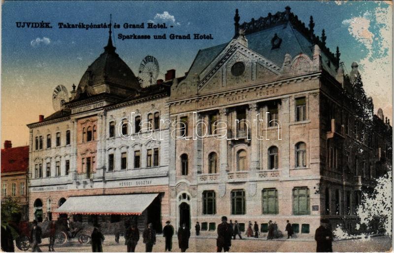 Újvidék, Novi Sad; Takarékpénztár és Mayer Grand Hotel nagy szálloda, sörcsarnok, Récsei Gusztáv üzlete / savings bank, hotel, beer hall, shop (felületi sérülés / surface damage)