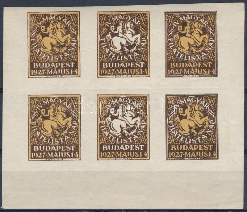 Leírás: 1927 Magyar Filatelista Nap vágott levélzáró hatostömb