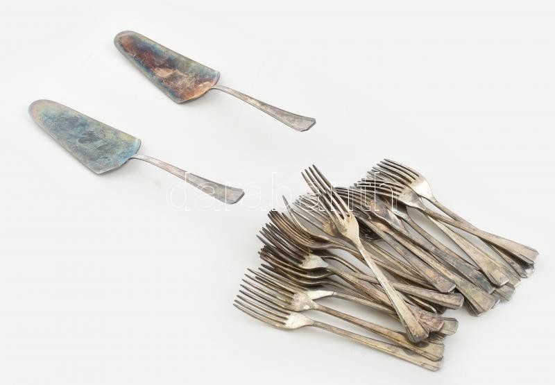 Leírás: 24 db süteményes villa és 2 db tortalapát, ezüstözött fém, jelzett: Berndorf., kopott