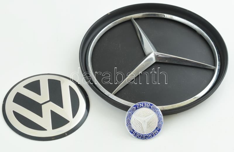 Leírás: 3 db autós embléma: 2 db Mercedes-Benz, és 1 db Volkswagen, kis kopásnyomokkal, d: 16 cm, 9 cm, 3,5 cm