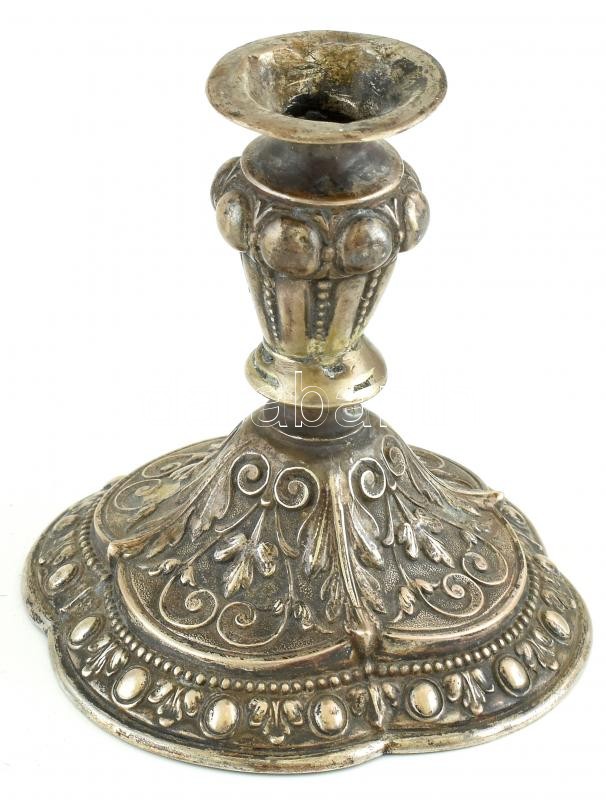 Leírás: Alpakka gyertyatartó, sérült, jelzés nélkül, kopott, m: 10cm