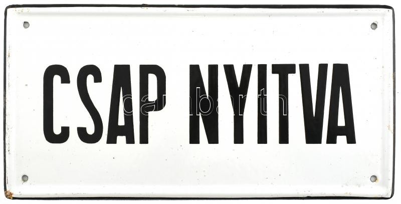 Leírás: "Csap nyitva" feliratos zománcozott fém tábla, bal alsó sarkában kissé sérült, 15x30 cm