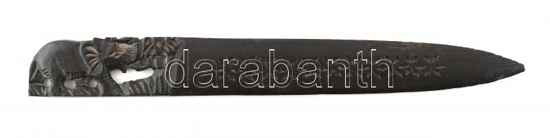 Leírás: Ébenfa levélbontó, figurális elefánt fafaragással, h: 21 cm
