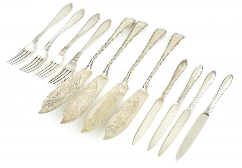 Leírás: Ezüstözött fém vegyes evőeszközök, jelzett, kopott.