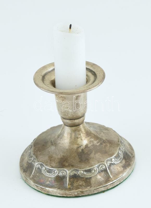 Leírás: Ezüstözött gyertyatartó, kopott, m: 8 cm