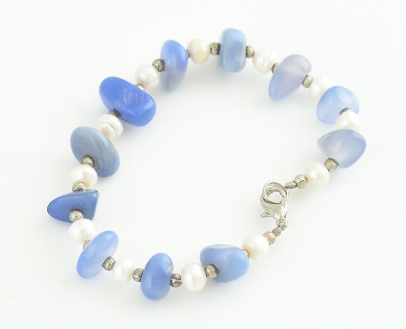 Leírás: Kék achát köves, tenyésztett gyöngy karkötő, h: 20 cm