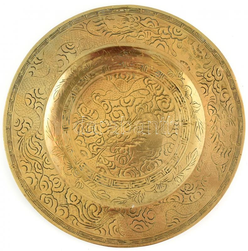 Leírás: Kínai réz dísztál sárkányos mintával, jelzett, kis kopásnyomokkal, d: 30,5 cm