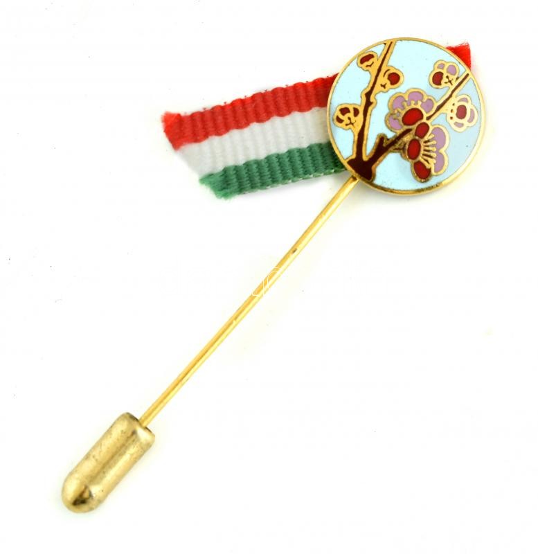 Leírás: Nyakkendőtű, aranyozott fém, sakura cseresznyevirág zománc díszítéssel. 6 cm