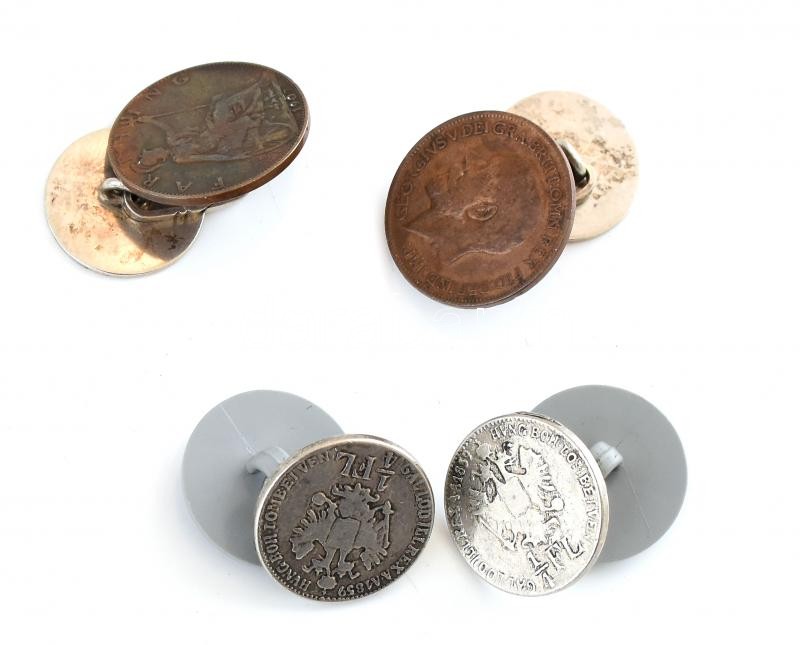 Leírás: Régi brit és osztrák pénzérmékből készített mandzsettagombok (1 Farthing-V. György, 1/4 Florin), 2 pár