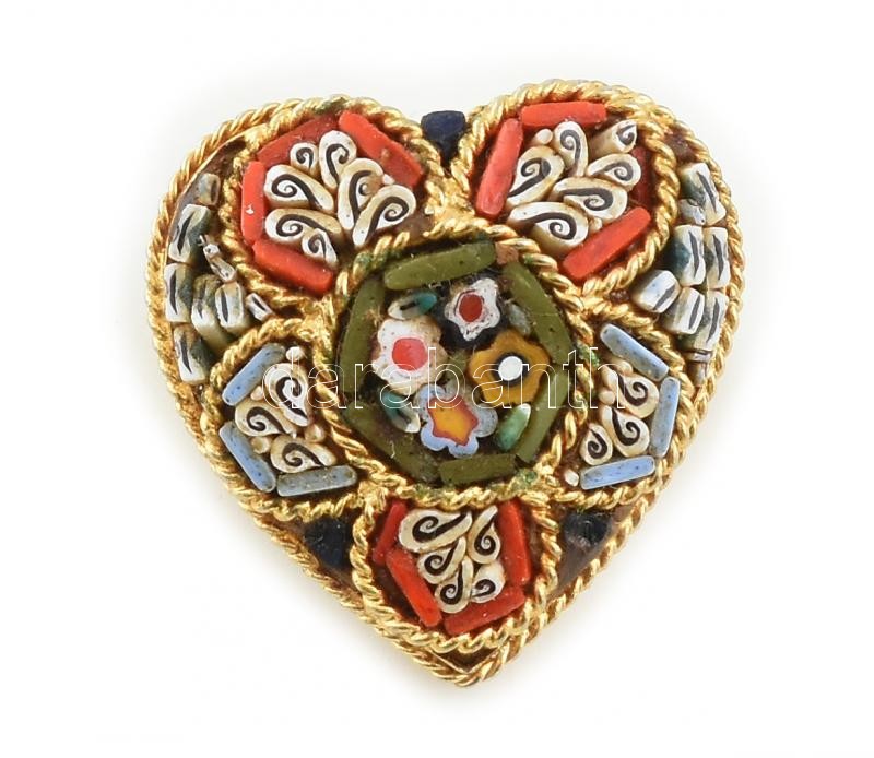 Leírás: Szív alakú mikromozaikos bross, fém, kopott, 2cm