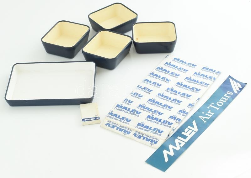 Leírás: Vegyes MALÉV tétel, 4 db tálka, 1 db tálca, 1 db tasak, 1 db szappan, 1 db Malév ragasztós logó,