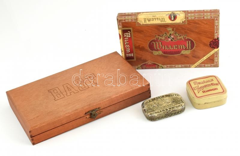 Vegyes doboz tétel. 1 db ReliAble Typewriter Ribbon fémdoboz, 1 db Morgan&Wright fém doboz, 1db Willem II szivaros karton doboz, 1db BASF fa doboz. Kopott, sérült. 4x7 és 12x21 cm között.