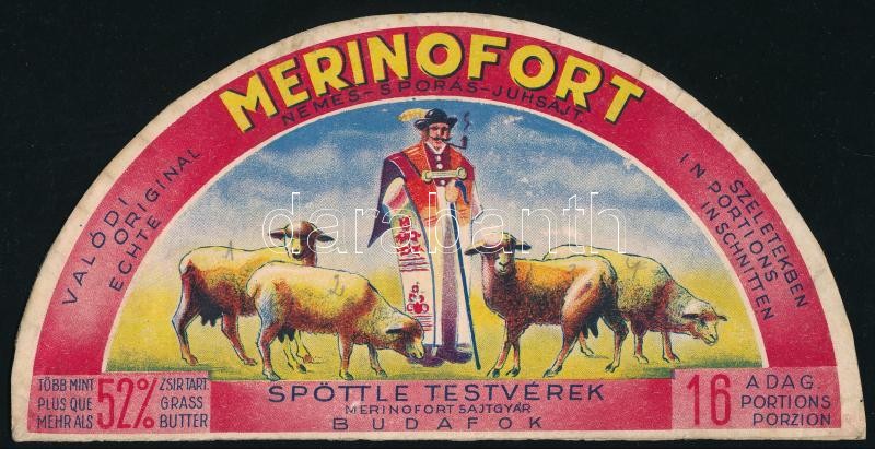 Leírás: Merinofort nemes-sporás juhsajt, Spöttle Testvérek Budafok. Reklám, 1940 körül. Ofszet, karton. Jelzés nélkül, 10×20,5 cm