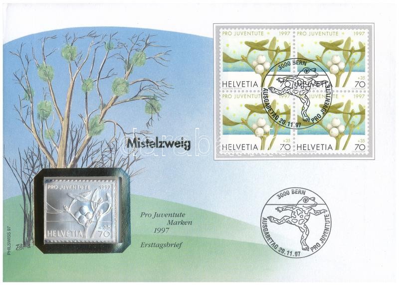 Leírás: Svájc 1997. "Pro Juventute 1997 70+35" jelzett Ag bélyegérem, "Fagyöngy" érmés borítékban, bélyeggel, bélyegzéssel (0.999) T:1 patina Switzerland 1997. "Pro Juventute 1997 70+35" hallmarked Ag commemorative medallion, in "Viscum" envelope with stamp and cancellation (0.999) C:UNC patina