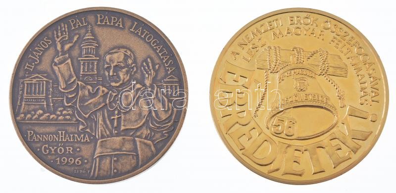1993. "56-os Magyarok Világtalálkozója - 1956 - Budapest 1993. okt. 15-18 / A nemzeti erők összefogásával lesz magyar feltámadás - Ébredjetek!" aranyozott fém emlékérem (42,5mm) + Lebó Ferenc (1960-) 1996. "II. János Pál pápa látogatása - Pannonhalma, Győr" Br emlékérem (42,5mm) T:1-