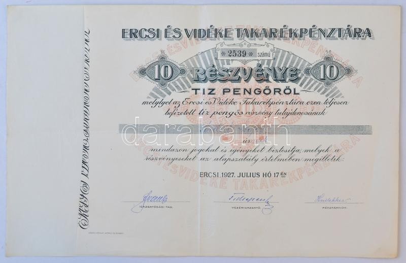 Ercsi 1927. "Ercsi és Vidéke Takarékpénztára" névre szóló részvénye 10... https://www.darabanth.com/hu/407-Gyorsarveres/407.0/Numizmatika/Reszvenyek-es-sorsjegyek~1500006/Ercsi-1927-Ercsi-es-Videke-Takarekpenztara-nevre-szolo-reszvenye-10P-rol-szarazpecsC3~II2518209