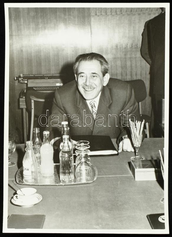 Leírás: Aczél György (1917-1991) kommunista kultúrpolitikus, minisztert ábrázoló fotó, fotó Hámori Gyuláné, a hátoldalán pecséttel jelzett, 17x12 cm