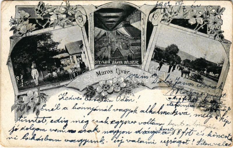 Leírás: 1902 Marosújvár, Uioara, Ocna Mures; fürdő, Stefánia bánya belseje, Király utca / spa, mine interior, street. Art Nouveau, floral (r)