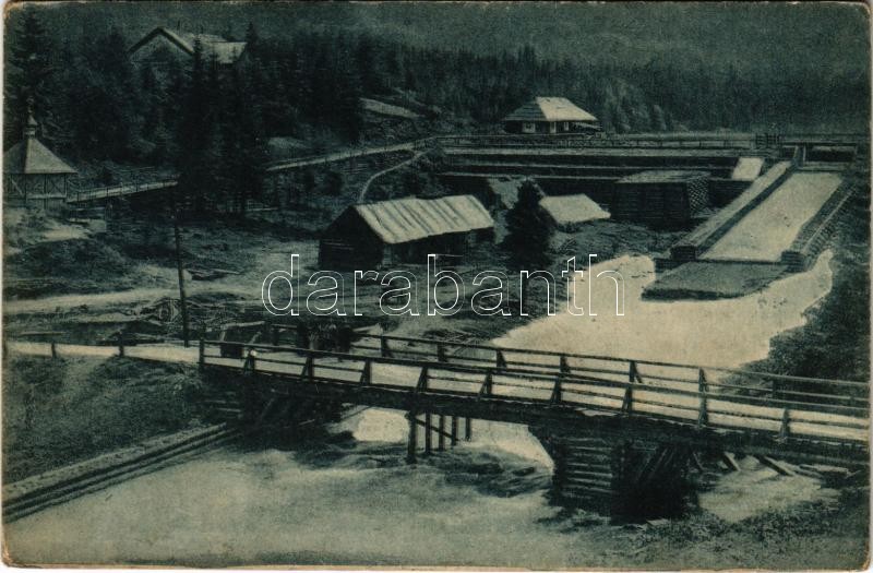 Leírás: 1917 Dorna-völgy, Dornavölgyi Gőzfűrész; Vízfogó és kápolna. Adler M. Mór kiadása 5854. / dam and chapel