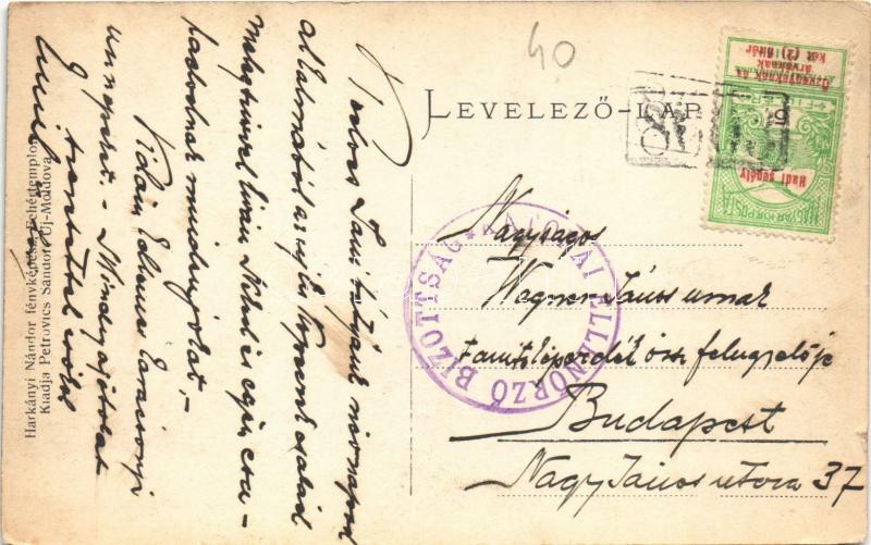 Leírás: Újmoldova, Bosneag, Moldova Noua; Harkányi Nándor fényképész, Petrovics Sándor kiadása + "KATONAI ELLENŐRZŐ BIZOTTSÁG" (aprócska szakadás / tiny tear)