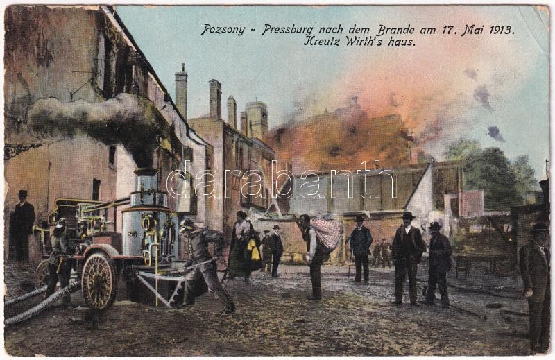 1913 Pozsony, Pressburg, Bratislava; a május 17-i nagy tűzvész a zsidó negyedben, Kreutz Wirth háza, tűzoltók / Nach dem Brande, Kreutz Wirth's Haus / burning building during the great fire in the Jewish district, firefighters (Rb)