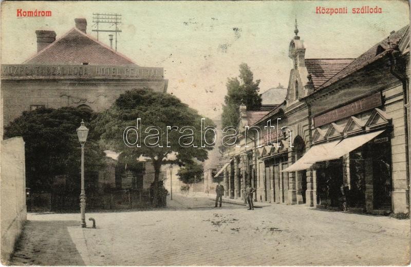 Leírás: Komárom, Komárnó; Központi szálloda, Stern Bernát és Kincs Mór üzlete. Laky Béla kiadása / hotel, shops (EK)