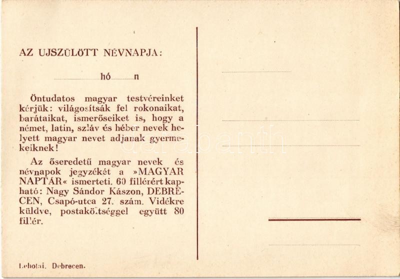 Öntudatos magyar testvéreinket kérjük: világosítsák fel rokonaikat, barátaikat, ismerőseiket is, hogy a német, latin, szláv és héber nevek helyett magyar nevet adjanak gyermekeiknek / Hungarian irredenta propaganda