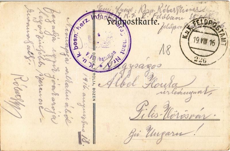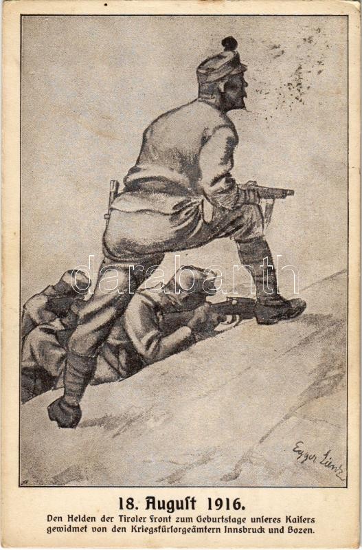 1916 Den Helden der Tiroler Front zum Geburtstage unseres Kaisers gewidmet von den Kriegsfürsorgeämtern Innsbruck und Bozen / WWI Austro-Hungarian K.u.K. military art postcard, Heroes of the Tyrolean Front. Druck Tyrolia s: Egger-Lienz + "K.u.K. bosn. herz. Infanterieregiment Nr. 1. V. Feldbataillon" (EK)