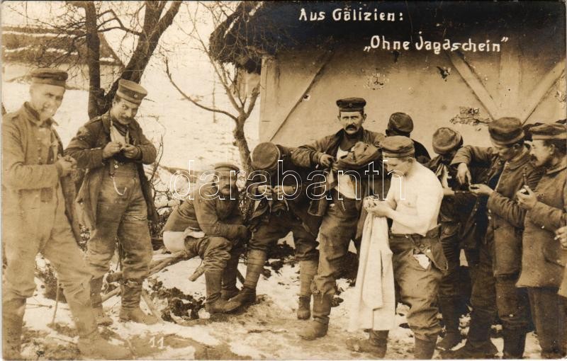 Aus Gälizien: Ohne Jagdschein / Első világháborús német katonák Galíciában, humoros / WWI German military humour, soldiers. photo (ragasztónyom / gluemark)