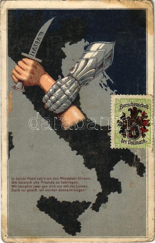 In deiner Hand seh'n wir den Mordstahl blinken... Italia. Offizielle Karte für Rotes Kreuz, Kriegsfürsorgeamt, Kriegshilfsbüro Nr. 149. / WWI Austro-Hungarian K.u.K. military art postcard, Anti-Italian propaganda (b)